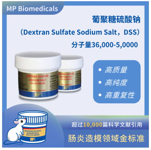 葡聚糖硫酸鈉(Dextran Sulfate Sodium Salt,DSS) 是一種聚陰離子衍生物,常用于誘導(dǎo)建立動(dòng)物潰瘍性結(jié)腸炎模型,是目前腸炎造模研究領(lǐng)域金標(biāo)準(zhǔn)。MP Biomedicals 生產(chǎn)的DSS具有高質(zhì)量、高純度、高重復(fù)性的特點(diǎn)。迄今為止,有超過10,000篇科學(xué)文獻(xiàn)引用,有效性得到了業(yè)界廣泛認(rèn)可。